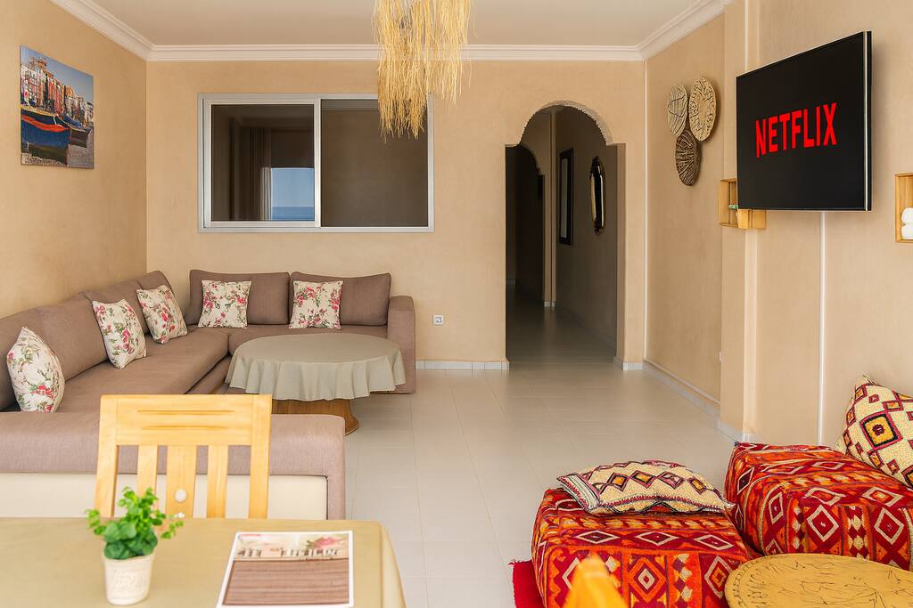 🌊 Stunning ocean view - Private terrace, perfect for your morning coffee 🏖️ Direct beach access - Just 10 steps from the sand! 🛋️ Spacious living room - Brand-new sofas, smart TV (Netflix, IPTV), Berber corner & décor, and local artwork 🍽️ Dining area for 4 - Enjoy meals with a view 🤗 Authentic Moroccan welcome - Warm and memorable check-in experience 💻 Reliable WiFi + workspace - Great for remote work 🛏️ Master bedroom (King bed) - Plush bedding & peaceful vibes 🛌 Second bedroom (2 bunk beds + 1 single) - Perfect for kids or friends 🚿 Modern bathroom - Shower adorned with Moroccan zellij tiles, hot water & fresh towels 👨🍳 Fully equipped kitchen: - Cooking essentials - Pots, pans, mini oven, gas stovetop, salt & pepper - Dinnerware & utensils - Plates, bowls, cutlery, glasses, and wine glasses 🍷 - Coffee machine with capsules and tea to start your day right ☕ - Fridge & freezer - To store fresh finds from the local market