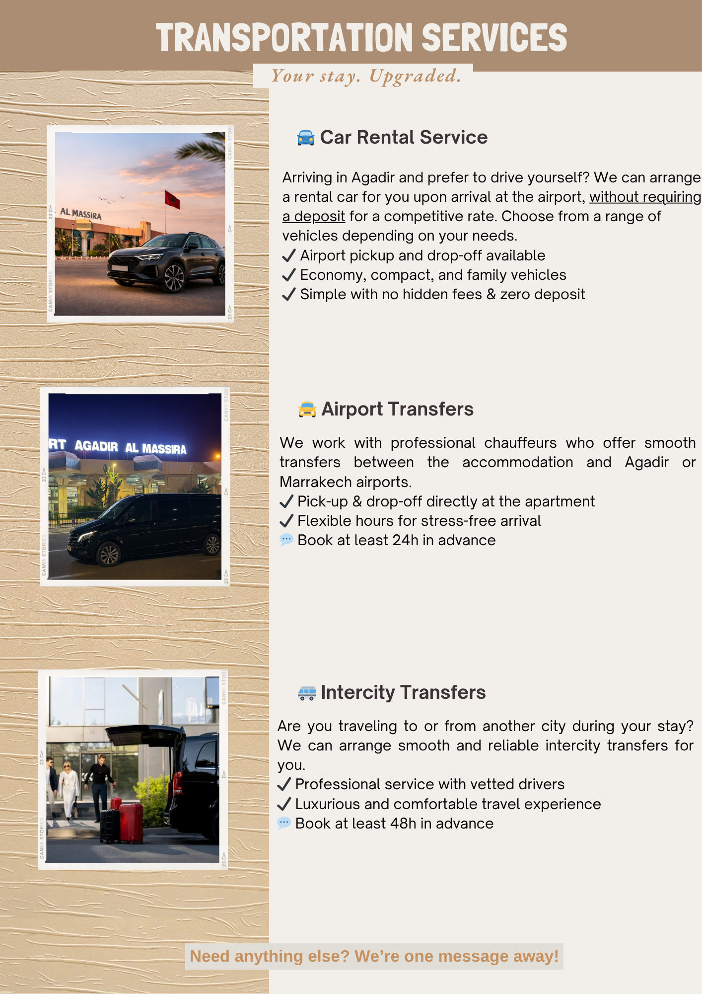 Looking for more than just a place to sleep? We can help you plan unforgettable local experiences without the hassle of searching, booking, and negotiating. Here are just a few of the things we can organize for you: 🚕 Private transfer from/to Agadir airport 🚘 Affordable car rentals without a deposit 🎁 Special Occasion Setup (Birthday, Honeymoon/Anniversary Package) 🏄♂️ Surf lessons for all levels with pro instructors 🏜️ Sandboarding at the Sahara coastal dunes 💧 Hidden Paradise Valley hike & swim 🐎 Quad & Horseback rides along the beach 🚗 Organized day trips to Agadir, Marrakech or Essaouira Send us a message for a fun personalized trip! Book your stay now before your dates are taken 💙