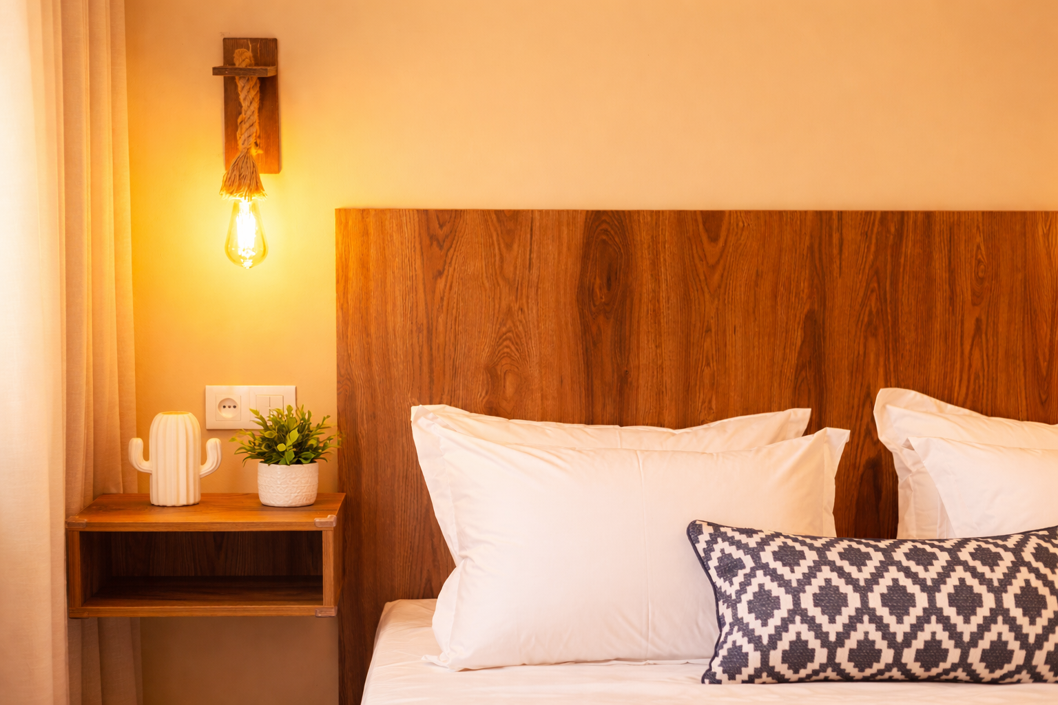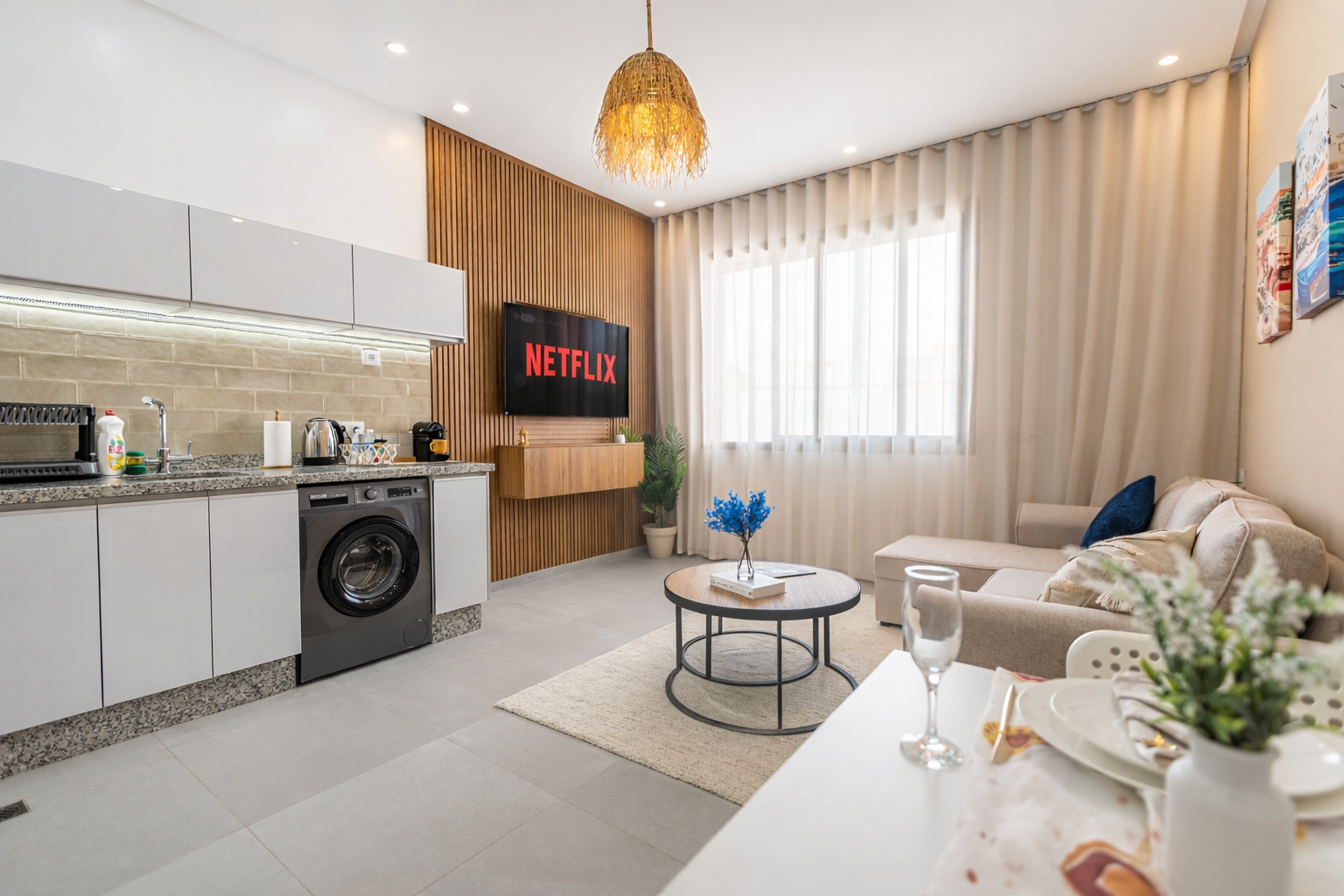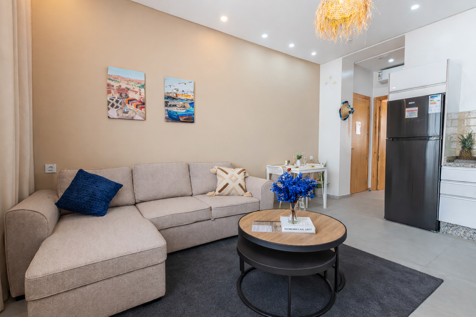 ☞ Bedroom - King-size bed with soft mattress - Soft & firm pillow options provided for better sleep - Makeup station with a mirror for getting ready - Dedicated work-from-home desk - Iron, iron board, extra linens, hangers, emergency kit... ☞ Living & dining area - Comfortable sofa bed (sleeps 2) - 55" 4K Smart TV with Netflix - Dining table for 3 people - Board games, guidebook, charging station and much more... Boho-chic décor blended with Moroccan local artwork is designed to make you feel at home 💛 ☞ Kitchen (fully stocked) - Electric stove, oven & microwave - Coffee corner (espresso, tea, sugar provided) - Washing machine (pods provided) - Fridge with freezer, blender & electric kettle - Popcorn machine (corn provided) - Wine glasses and wine opener - Fully equipped cookware & utensils ☞ Bathroom - Italian walk-in shower with double shower heads (rain + handheld) - Modern design with traditional Moroccan tiles - Hair dryer, shampoo & shower gel provided - Shower towels + dedicated makeup towels ☞ Outdoor shared spaces - Garden with seating for morning coffee or romantic evenings - Rooftop with sun loungers for relaxation and tanning, open views overlooking the sea and the Atlas mountains, and unforgettable sunsets ✭"Simply the best location to relax in my opinion away from the noise with Taghazout just minutes away." Add my listing to your wishlist by clicking the ❤️ in the upper-right corner. A small welcome gift is included at check-in (no spoilers🤐) You need more than 1 bedroom? You can book 2+ apartments in the same villa. Send us a message to book 💛