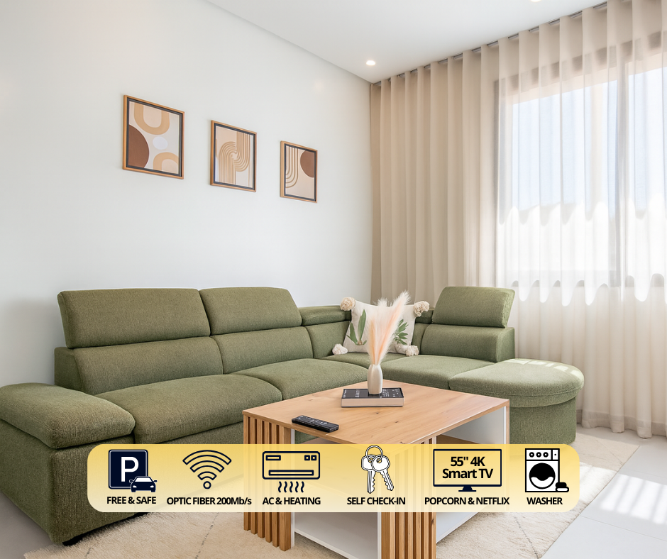 ☞ Bedroom - Queen-size bed with soft mattress - Soft & firm pillow options provided for better sleep - Makeup station with a mirror for getting ready - Dedicated work-from-home desk - Iron, iron board, extra linens, hangers, emergency kit... ☞ Living & dining area - Comfortable sofa bed (sleeps 2) - 55" 4K Smart TV with Netflix - Dining table for 3 people - Board games, guidebook, charging station and much more... Cactus-themed décor blended with Berber local artwork is designed to make you feel at home 💛 ☞ Kitchen (fully stocked) - Electric stove, oven & microwave - Coffee corner (espresso, tea, sugar provided) - Washing machine (pods provided) - Fridge with freezer, blender & electric kettle - Popcorn machine (corn provided) - Wine glasses and wine opener - Fully equipped cookware & utensils ☞ Bathroom - Italian walk-in shower with double shower heads (rain + handheld) - Modern design with traditional Moroccan tiles - Hair dryer, shampoo & shower gel provided - Shower towels + dedicated makeup towels ☞ Outdoor shared spaces - Garden with seating for morning coffee or romantic evenings - Rooftop with sun loungers for relaxation and tanning, open views overlooking the sea and the Atlas mountains, and unforgettable sunsets ✭"Simply the best location to relax in my opinion away from the noise with Taghazout just minutes away." Add my listing to your wishlist by clicking the ❤️ in the upper-right corner. A small welcome gift is included at check-in (no spoilers🤐) You need more than 1 bedroom? You can book 2+ apartments in the same villa. Send us a message to book 💛