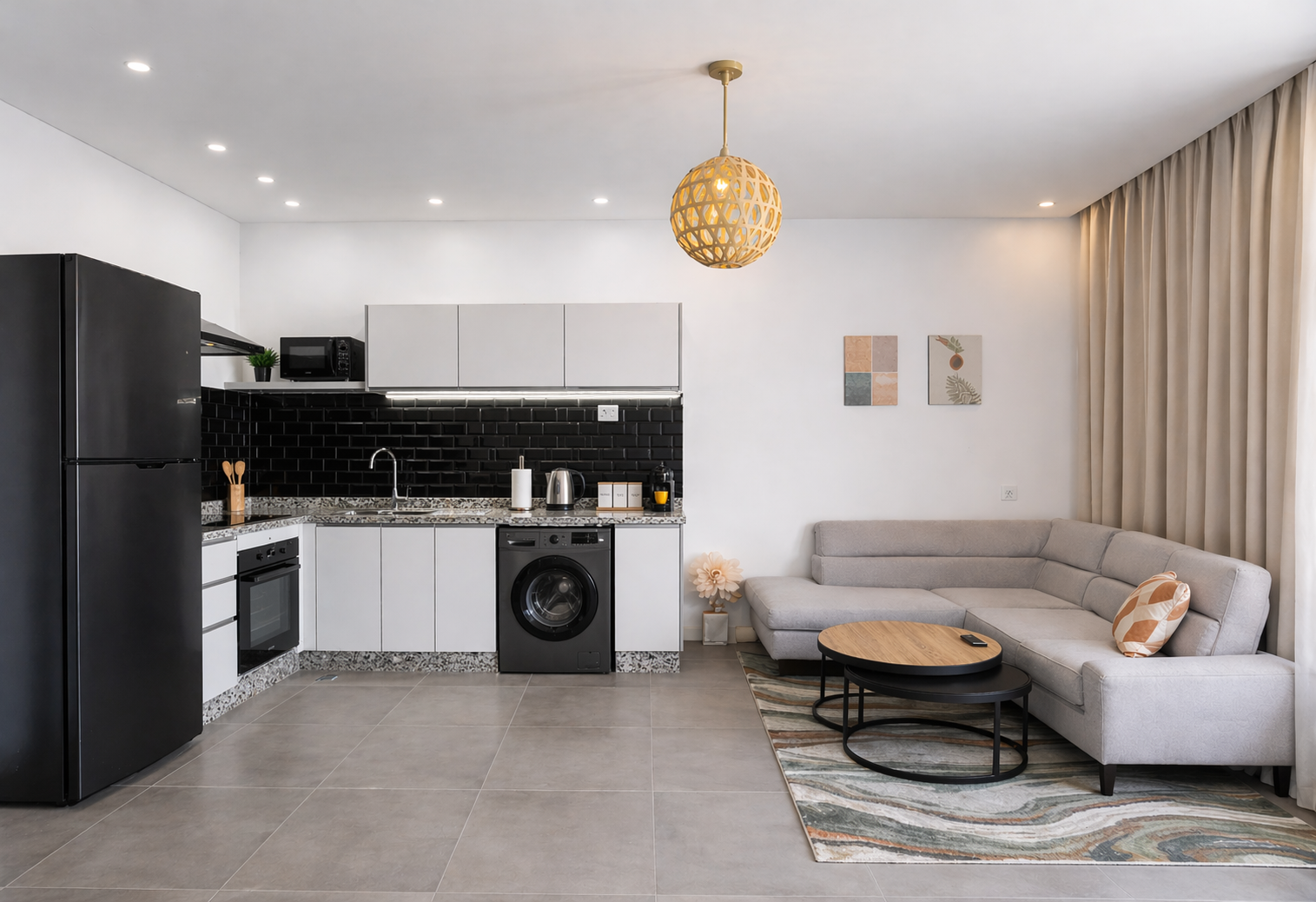 ☞ Bedroom - Queen-size bed with soft mattress - Soft & firm pillow options provided for better sleep - Makeup station with a mirror for getting ready - Dedicated work-from-home desk - Iron, iron board, extra linens, hangers, emergency kit... ☞ Living & dining area - Comfortable sofa bed (sleeps 2) - 55" 4K Smart TV with Netflix - Dining table for 4 people - Board games, guidebook, charging station and much more... Forest-themed apartment blended with local berber artwork is designed to make you feel at home 💛 ☞ Kitchen (fully stocked) - Electric stove, oven & microwave - Coffee corner (espresso, tea, sugar provided) - Washing machine (pods provided) - Fridge with freezer, blender & electric kettle - Popcorn machine (corn provided) - Wine glasses and wine opener - Fully equipped cookware & utensils ☞ Bathroom - Italian walk-in shower with double shower heads (rain + handheld) - Modern design with traditional Moroccan tiles - Hair dryer, shampoo & shower gel provided - Shower towels + dedicated makeup towels ☞ Outdoor shared spaces - Garden with seating for morning coffee or romantic evenings - Rooftop with sun loungers for relaxation and tanning, open views overlooking the sea and the Atlas mountains, and unforgettable sunsets ✭"Simply the best location to relax in my opinion away from the noise with Taghazout just minutes away." Add my listing to your wishlist by clicking the ❤️ in the upper-right corner. A small welcome gift is included at check-in (no spoilers🤐) You need more than 1 bedroom? You can book 2+ apartments in the same villa. Send us a message to book 💛